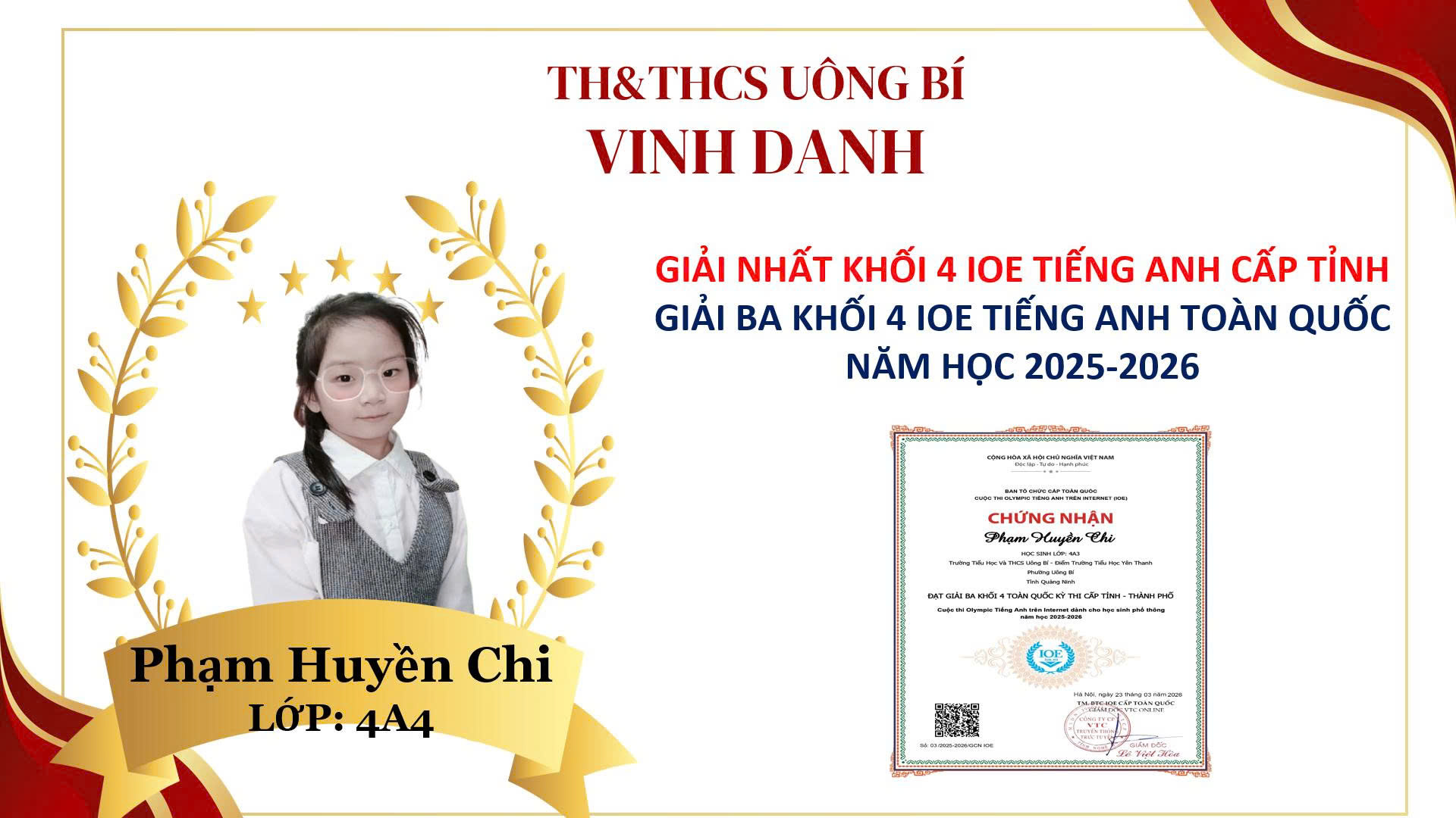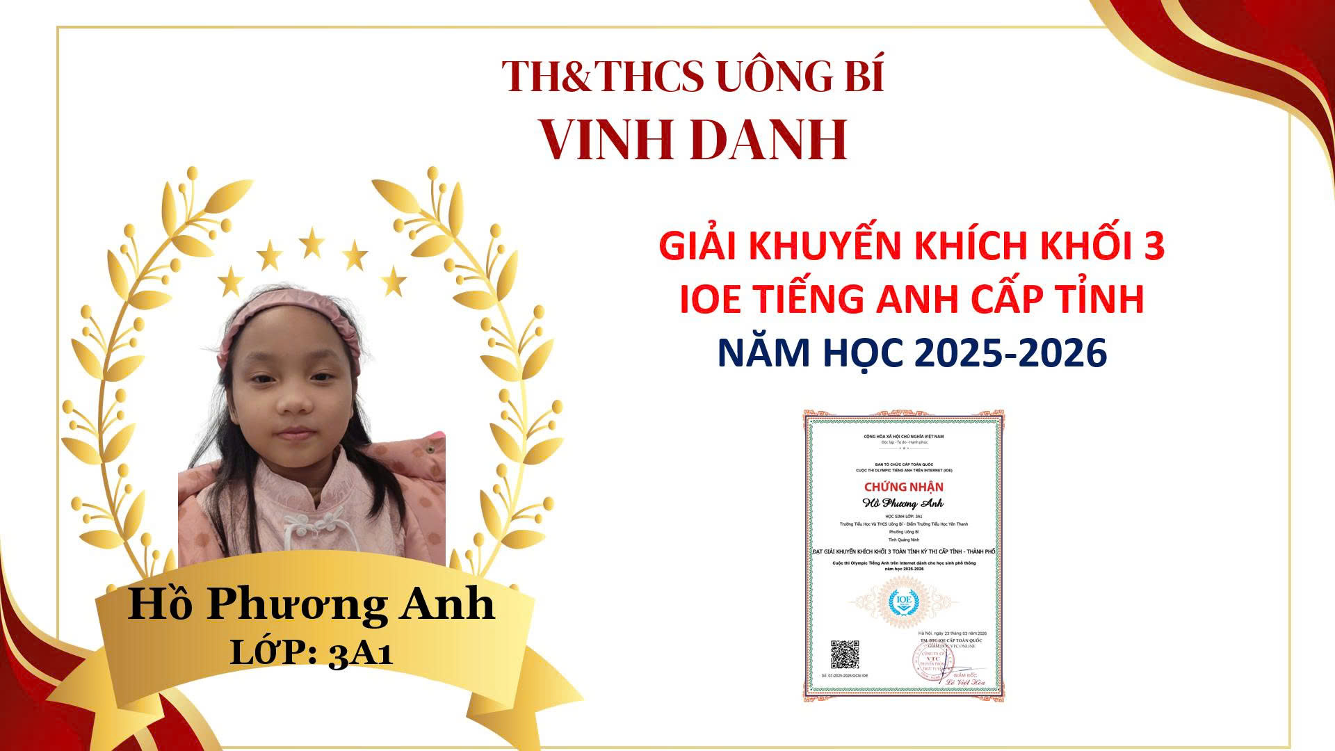 Trong năm học 2025–2026, học sinh Trường TH&THCS Uông Bí – Điểm trường Tiểu học Yên Thanh đã tích cực tham gia Cuộc thi IOE và Trạng nguyên Tiếng Việt trên Internet và đạt được những kết quả đáng khích lệ, thể hiện tinh thần học tập nghiêm túc và quyết tâm cao qua mỗi cuộc thi.