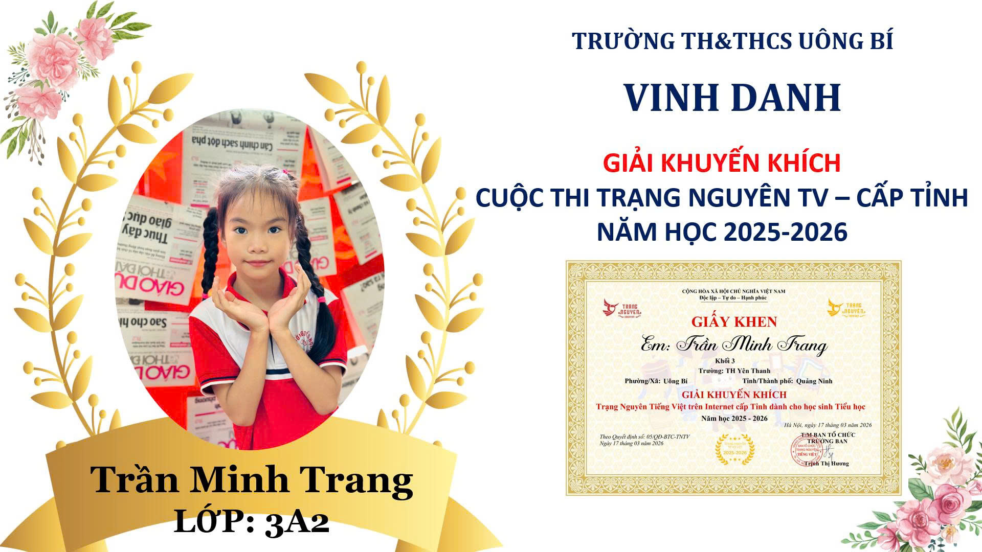 Trần Minh Trang – Lớp 3A2: Giải Khuyến khích cấp tỉnh.